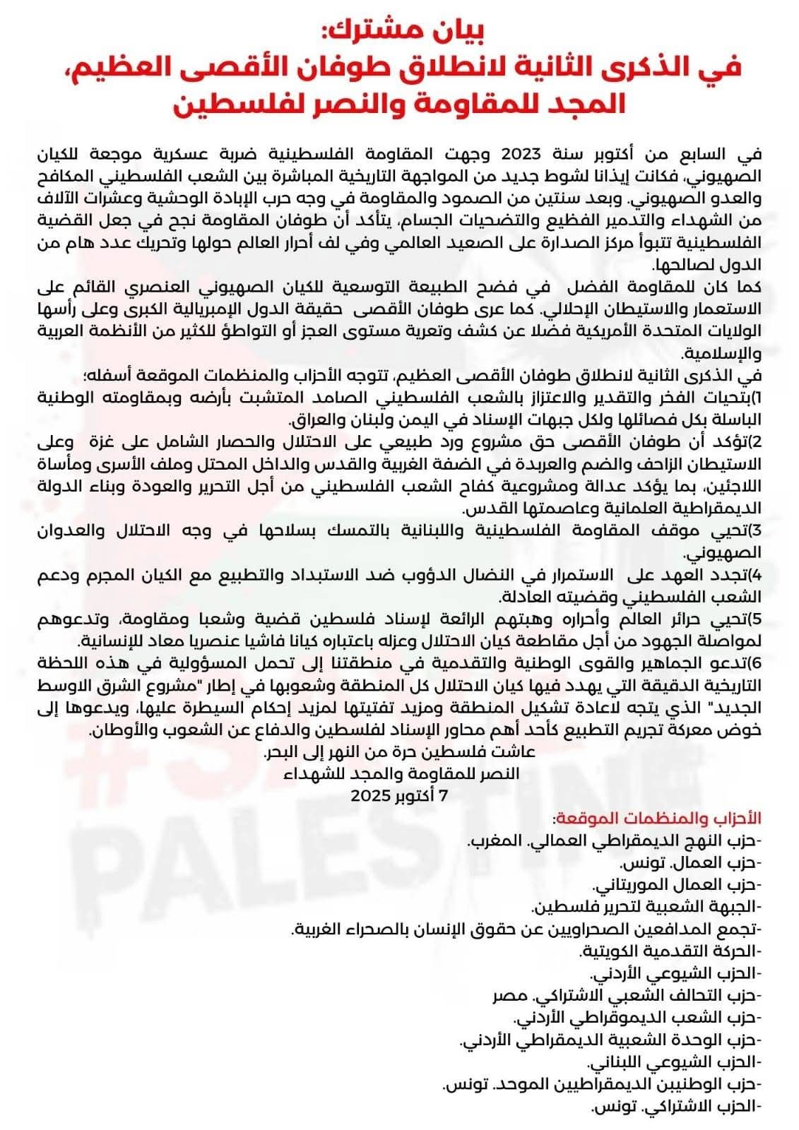 القضية الفلسطينية بيان مشترك: في الذكرى الثانية لانطلاق طوفان الأقصى العظيم، المجد للمقاومة والنصر لفلسطين