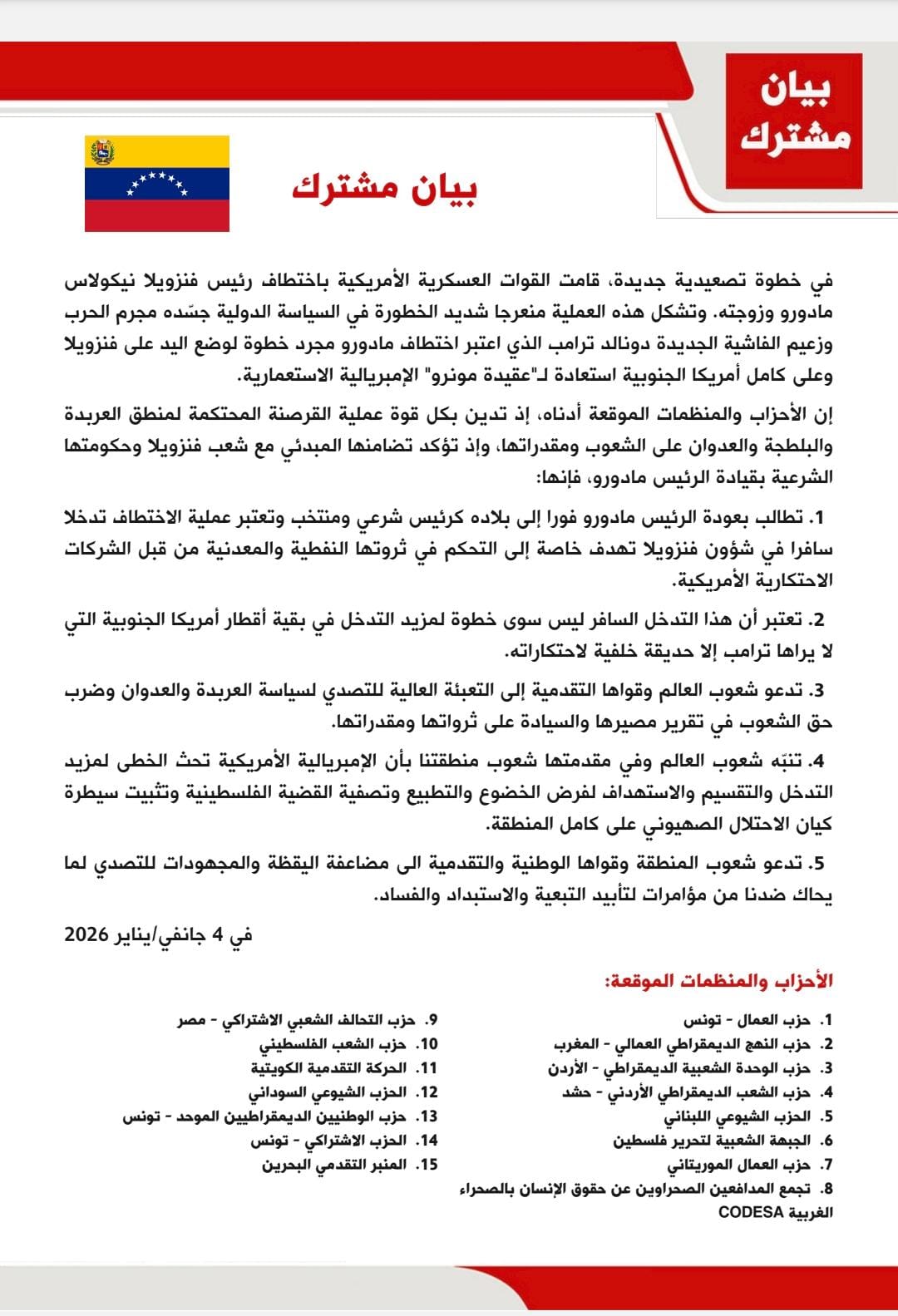 المكتب السياسي حزب النهج الديمقراطي العمالي يدين بشدة العدوان الإمبريالي الأمريكي على فنزويلا ويعلن تضامنه المطلق مع الشعب الفنزويلي
