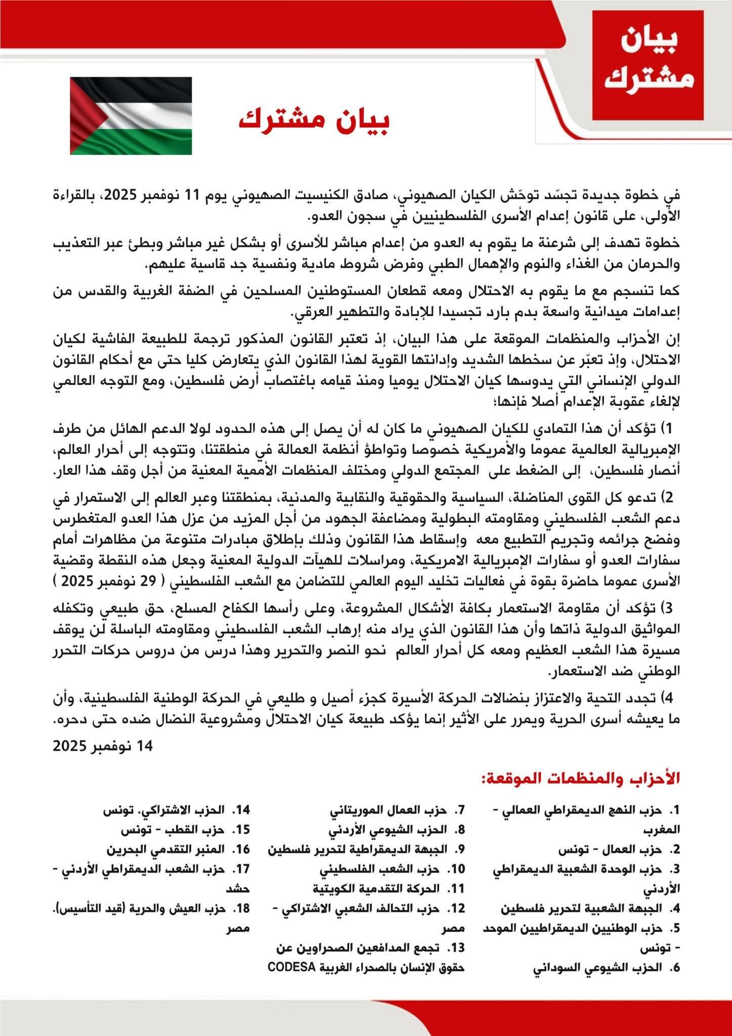 بيان مشترك للأحزاب والمنظمات التقدمية نصرة للشعب الفلسطيني ضد التوحش الصهيوني