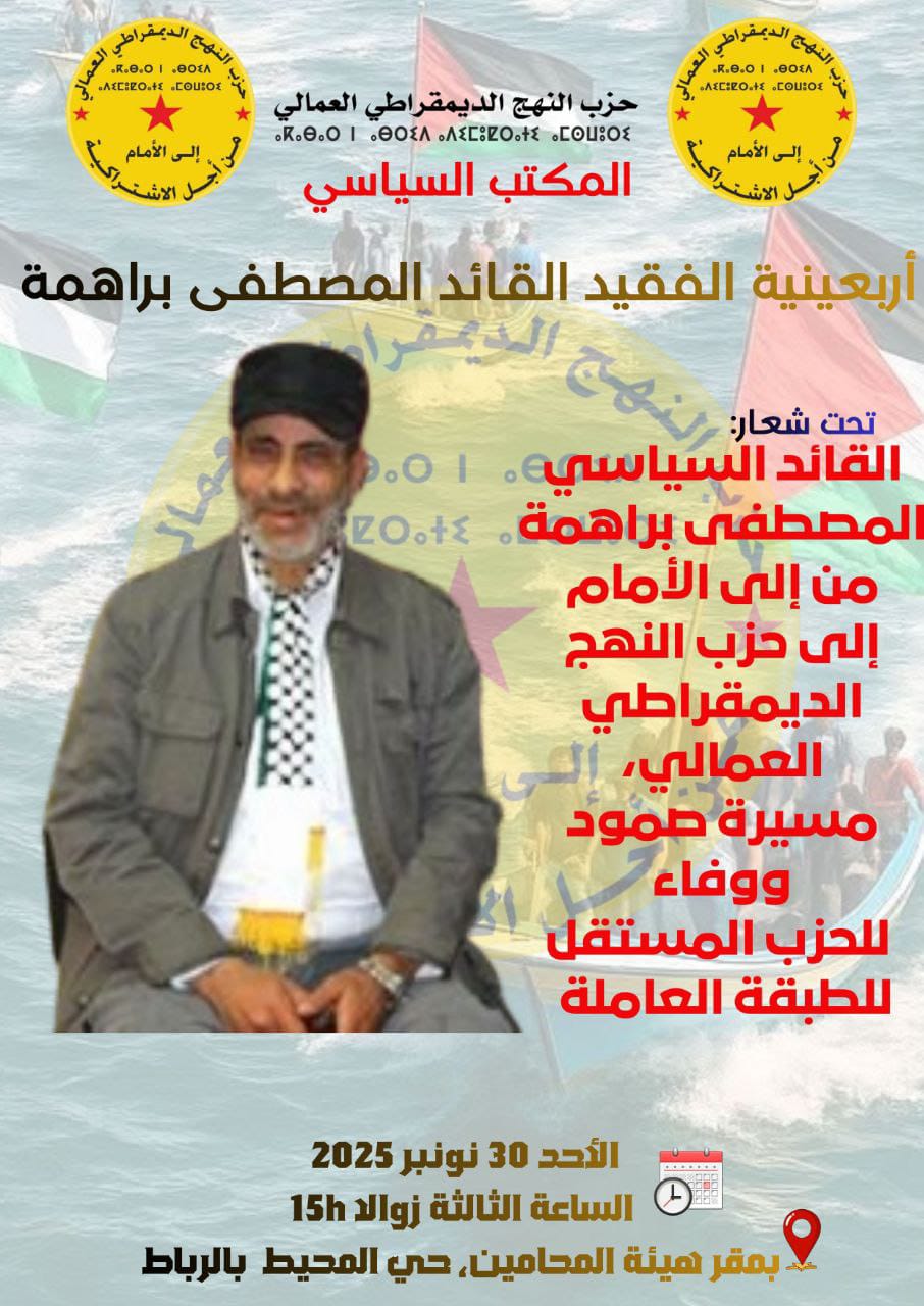 المكتب السياسي المكتب السياسي لحزب النهج الديمقراطي العمالي ينظم أربعينية الفقيد القائد المصطفى براهمة