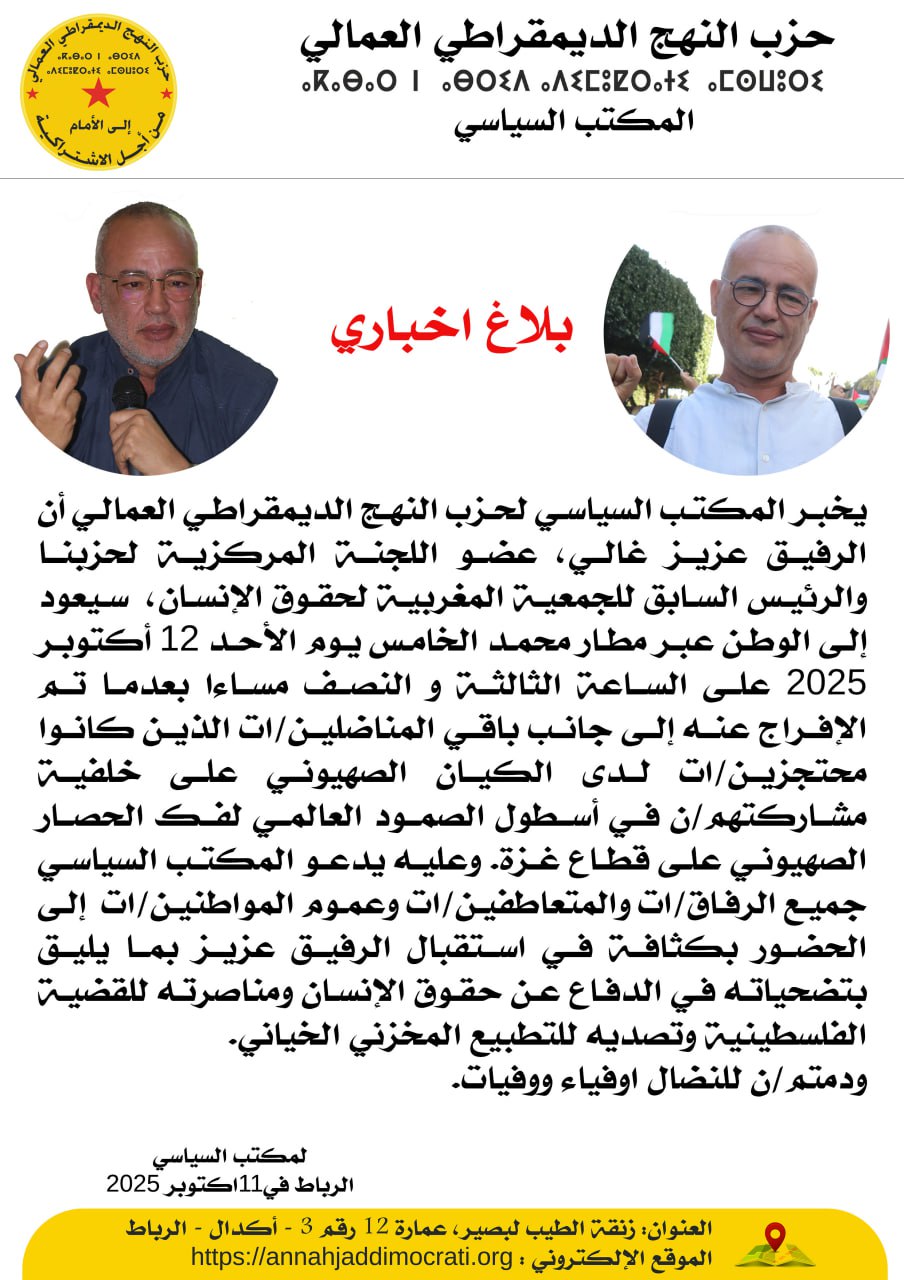 المكتب السياسي حزب النهج الديمقراطي العمالي يدين بشدة استمرار اختطاف الرفيق عزيز غالي والتعذيب والتنكيل به وبنشطاء أسطول الصمود