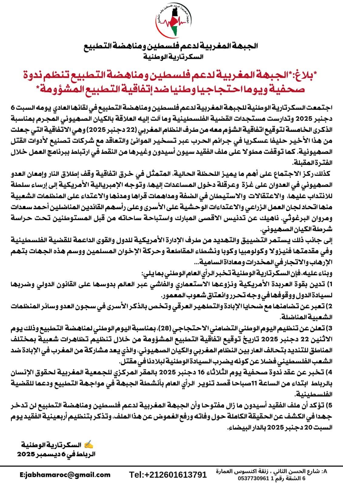 الجبهة المغربية لدعم فلسطين ومناهضة التطبيع تنظم ندوة صحفية ويوما احتجاجيا وطنيا ضد إتفاقية التطبيع المشؤومة